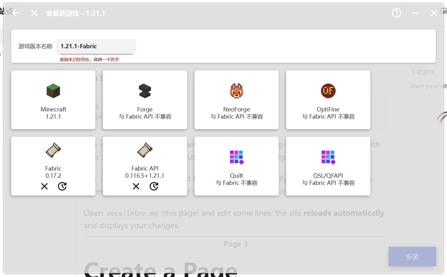 选择1.21.1版本并勾选最新版的Fabric及Fabric API