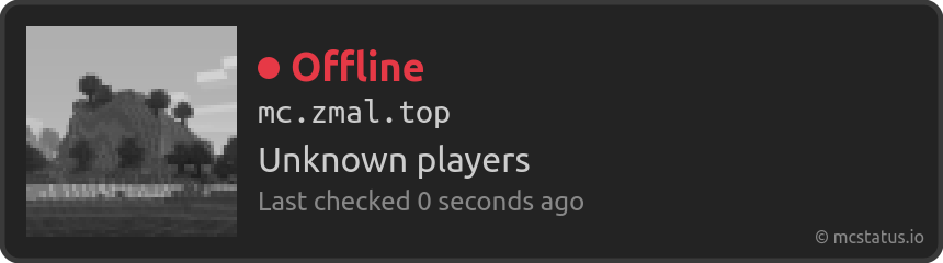 status本页总览status当前服务器状态 zmal不是富婆,目前服务器采用的是本地运行加frp广播的方式,所以你也许需要通过一些方式在进入游戏前检查服务器状态。当服务器不在运行中时你可以通过任何方式联系我,让zmal启动服务器(阴间时间zmal也不一定在线